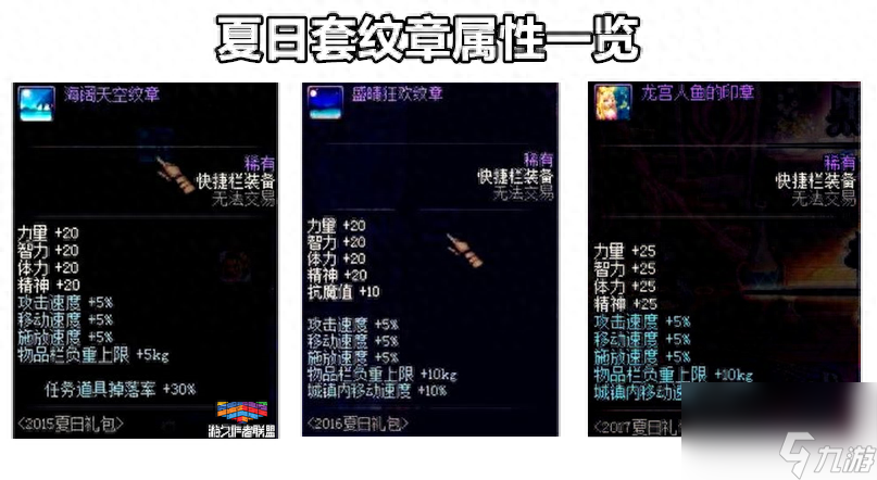 说起纹章装备,还是要看夏日套的,大家可以看到15、16和17年的夏日套纹章属性对比,17年的夏日套纹章是三年来夏日套纹章中属性最好的,就连往年包括今年的五一套纹章都无法超越。而商城的五一套下架后不久就是夏日套的到来了,所以想要一个比较好的纹章装备还得看今年的夏日套。