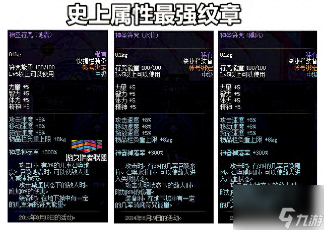 当然夏日套的纹章并不是属性最强的纹章,而14年免费赠送的神圣符咒才是DNF史上最强纹章,重点是纹章的机制是帐号绑定的,相信现在没有多少玩家还保留有这个纹章了。