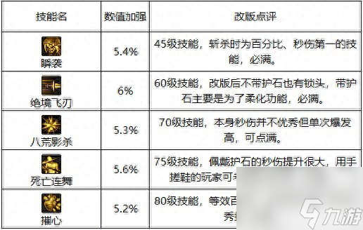 1.基础数值改动主力无色技能加强幅度平均在5%,预计改版后整体输出提升大概2.5%左右。重点在于技能形态优化和续航能力增加。具体优化如下:①改善背击判定;追影步追踪敌人无效的情况改善;②减少潜行领域的漏怪概率;刃舞用追影步柔化时会产生分身代替释放技能;③绝命飞刀不带护石也可以锁头了;④幽冥链狱 : 索命(二觉)新增聚怪动作,且二觉链子命中怪物后可增加1秒二觉持续时间,二觉改版后最多持续80秒;⑤穿心在学习三觉被动后,预约使用时默认背击。2.重做技能部分点评