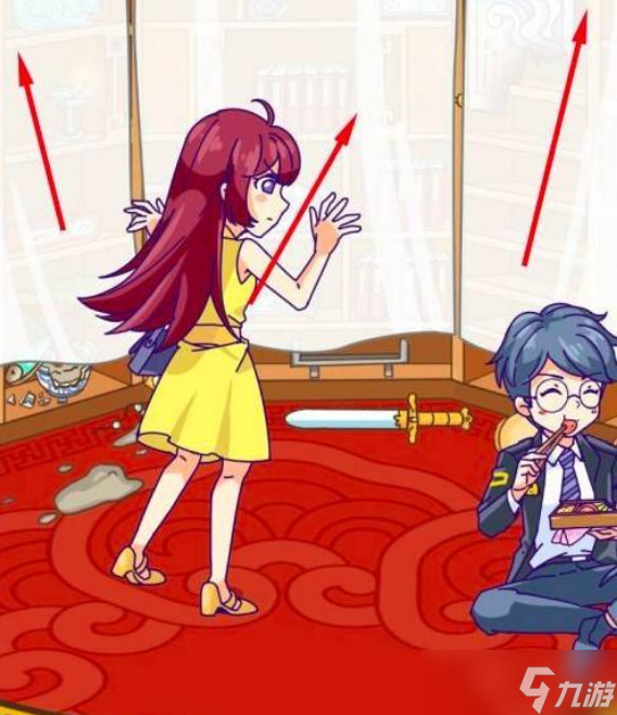 将女主的便当给博物馆调查员,之后向上滑动三个纱帘。滑动书架上的书籍,露出丢在书后面的小手电筒。