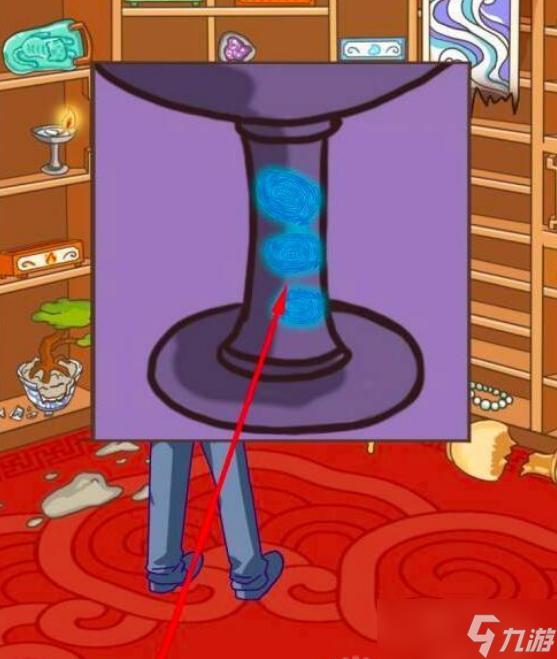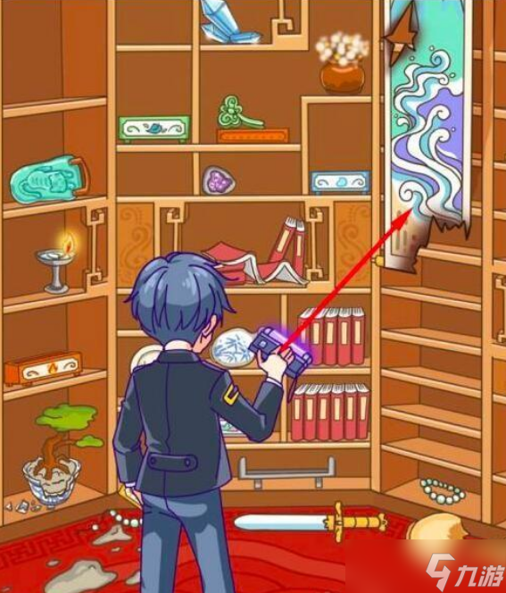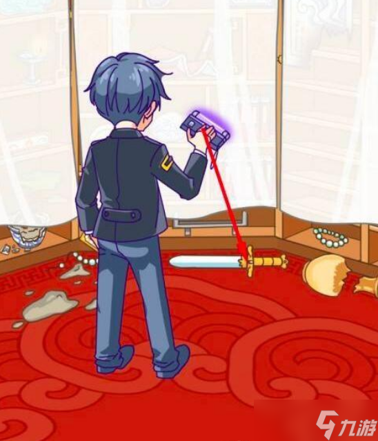 拖动紫外线灯到宝剑上。出现细节图,上面有指纹。