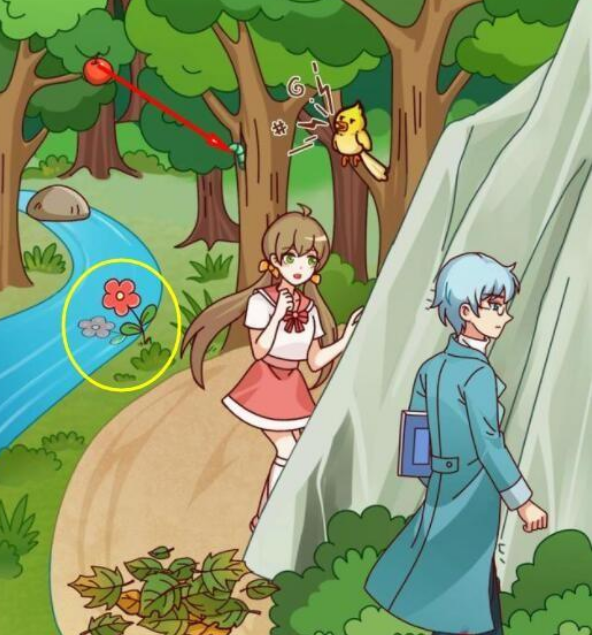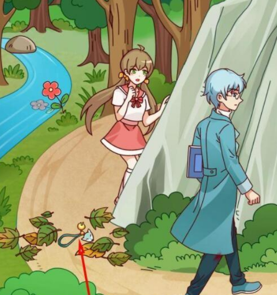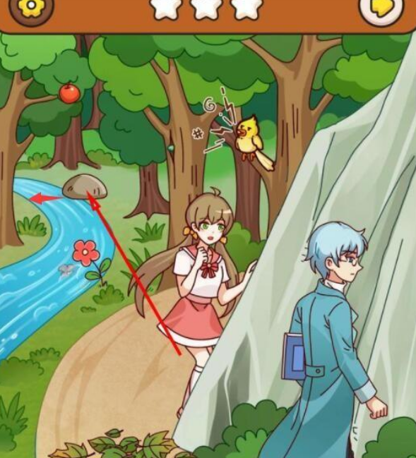 1、向左滑动小溪边上的石头,溪水被石头堵上后,溪边的花倒影出现在溪水里,点击即可获得第一件道具。