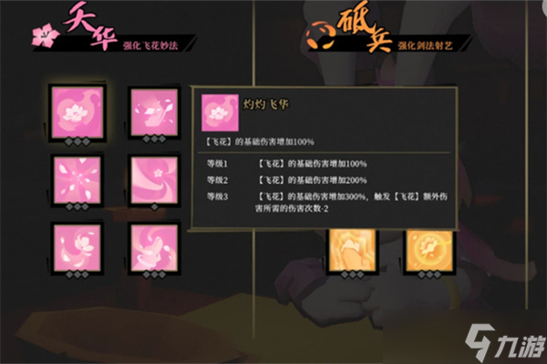 1、天赋选择:我们要优先提升“夭华”中的灼灼飞华,这个天赋可以大幅增加飞花的基础伤害和触发条件,让飞花更容易爆炸。