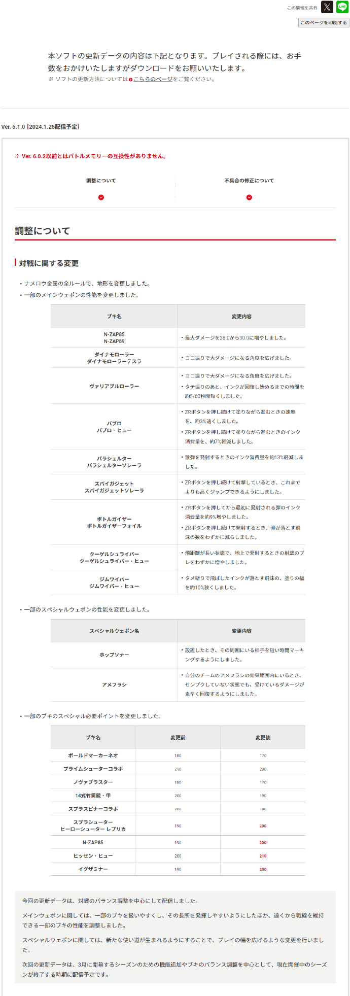 斯普拉遁3将于1月25日上午9点推送6.1.0版本更新,更新后6.0.2版本前的对战录像将无法播放。