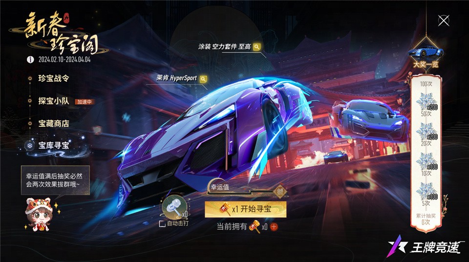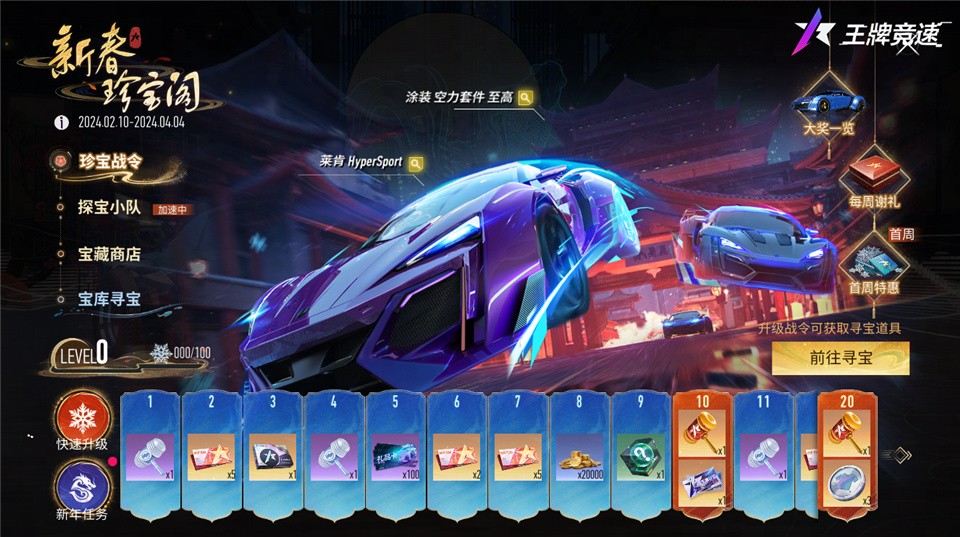 新春珍宝阁由珍宝战令、探宝小队、宝藏商店和宝库寻宝四大玩法组成,车手们可以完成各类任务获取积分,提升战令等级,解锁龙年金锤子、外观币、万能零件、王牌补给券等奖励;也可以与车友组成探宝小队,提升小队战令总等级,获取包括炫彩背饰在内的多种好礼;还可使用各类玩法中赢取的寻宝礼券在宝藏商店中兑换莱肯 HyperSport蓝图、龙年金锤子、莱肯操控台、冰封之心气泡、机械舞者车牌等珍贵道具;使用龙年金锤子在宝库寻宝活动中随机抽奖,更有机会获取永久车辆、限量涂装等超级大奖!