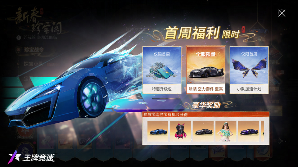 为了庆祝龙年的到来,王牌速度节还为新春珍宝阁量身定制了多重福利——首周特惠升级包、首周限时小队加速计划、每周谢礼、累抽奖励、幸运值大礼、快速升级礼包将密集来袭,助你顺利拿下龙年第一份超级大奖!