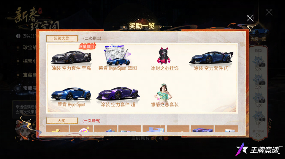 2月10日起,莱肯 HyperSport将加入新春珍宝阁,与全服限量涂装-空气套件至高、冰封之心挂饰、雏菊之恋套装等珍礼一同亮相,并为车手们带来多重福利!