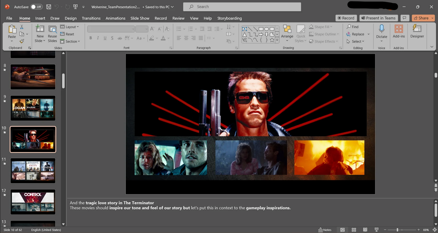 另一位用户提到,预告片使用了冰岛歌手碧玉(Björk)的经典曲目《Hunter》的混音版本。这首曲子也被用作 2019年电影《终结者:黑暗命运》的预告。发帖人分享了演示文稿的另一个部分,展示了失眠组制作游戏的许多灵感来源,其中就包括《终结者》,此外还有《谍影重重》、《幕狼罗根》(电影LOGAN)、《疾速追杀》,游戏灵感来源则除了《控制》外还包括《战神:诸神黄昏》、《刺客信条:大革命》以及《神秘海域4》。