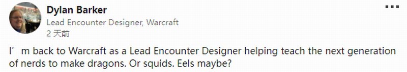 Barker回归《魔兽世界》团队后,担任首席遭遇战设计师的职位,负责主导设计《魔兽世界》Boss战。许多暴雪同事也前来祝贺他重新回归团队。