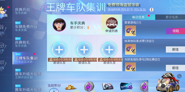 3月15日至4月4日,新一轮王牌车队集训活动将限时开启。组建集训小队后,通过完成点赞、与好友组队参赛等每日任务和参与指定场次比赛等累计任务获取积分,随着积分的提升,对应的金币、万能零件、礼品点等奖励也将陆续被解锁,获取1000积分后,便可获得终极大奖招财福鼠-海盗鼠涂装!