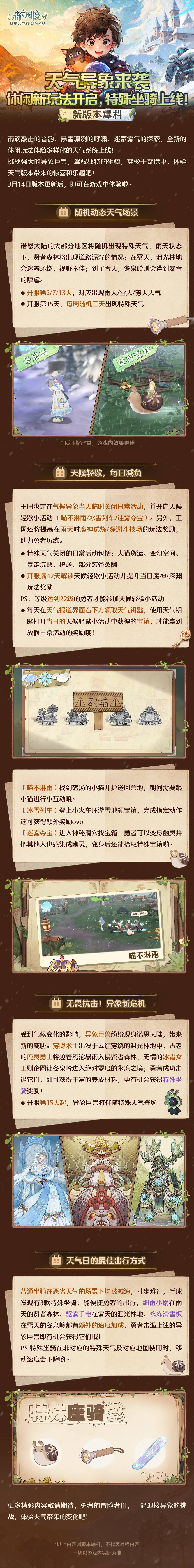 挑战强大的异象巨兽,驾驭独特的坐骑,穿梭于奇境中,体验天气版本带来的惊喜和乐趣吧!
