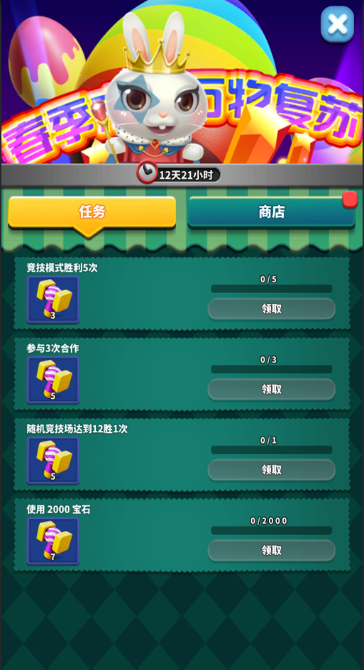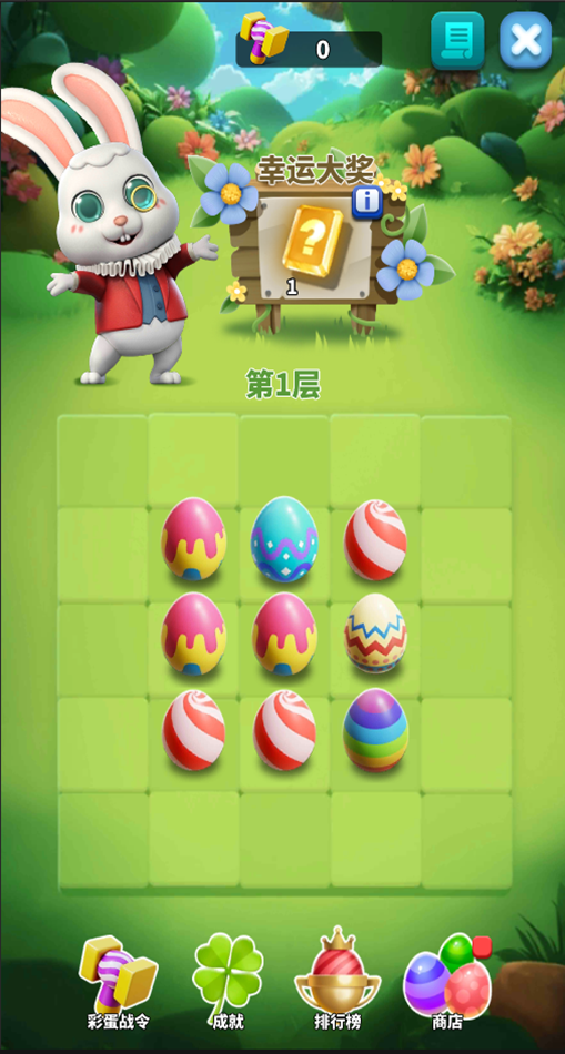 首次进入界面我们将会看到一只可爱的小兔子等着我们一起用锤子敲击彩蛋,每个彩蛋有着不同的奖励,我们可以通过完成任务来获取锤子敲击彩蛋获取奖励,获取大奖即可进入下一层。(砸蛋获取奖励概率为100%)