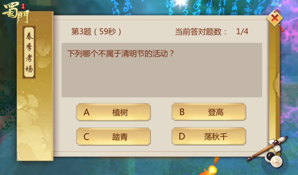 活动内容:春季考试,快乐答题!活动期间,每日共4题,参与即可获得春光满园*1及丰厚的经验、灵力奖励,除此之外,每题第一位答对的玩家还可额外获得50点福利点和5万世界红包。