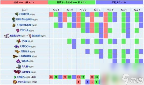 此事件以初次击杀任意一个机械boss、初次击杀石巨人这两个分界点,分为三档难度,NPC也会出售更高级的、使用护卫奖章购买的物品。随着难度提升,完成事件需度过的波数、事件独有敌怪种类等会变多变难,但奖励也会变得更加丰厚。具体如下图。