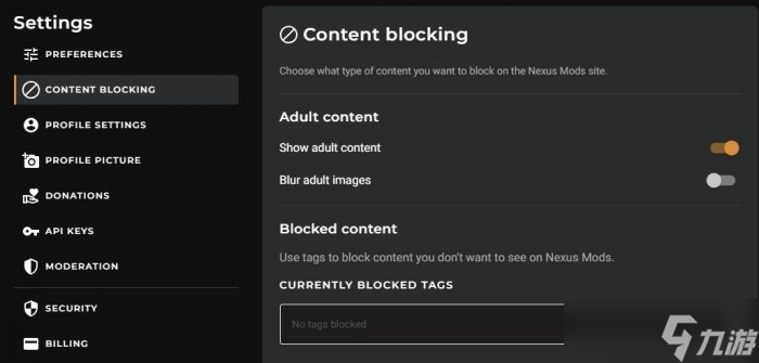 如果你想要解开好孩子内容,鼠标移到头像,在下拉菜单选择Site Preference,在内部找到Content Blocking并修改设置。