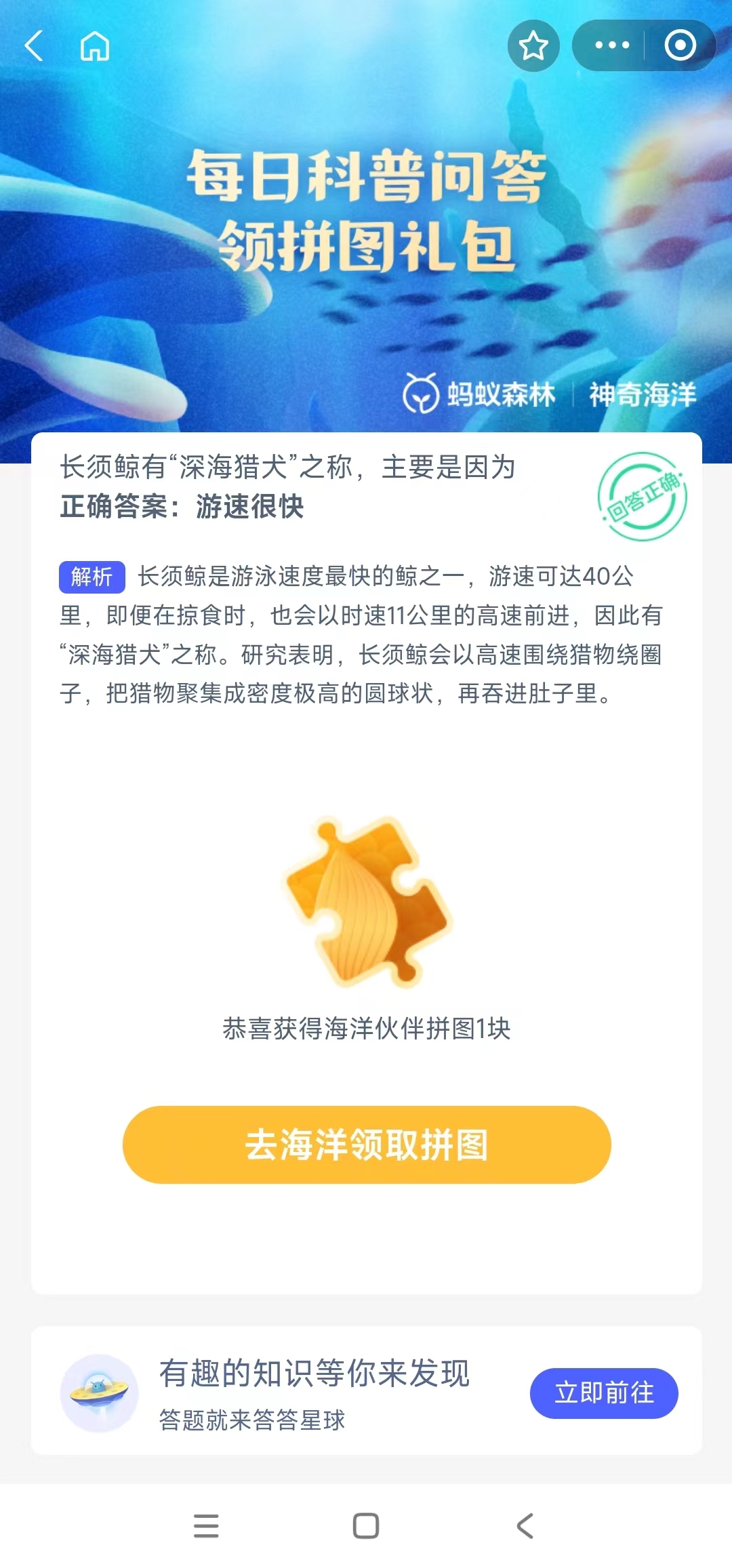 解析:长须鲸是游泳速度最快的鲸之一,游速可达40公里,即便在掠食时,也会以时速11公里的高速前进,因此有深海猎犬”之称。研究表明,长须鲸会以高速围绕猎物绕圈子,把猎物聚集成密度极高的圆球状,再吞进肚子里。