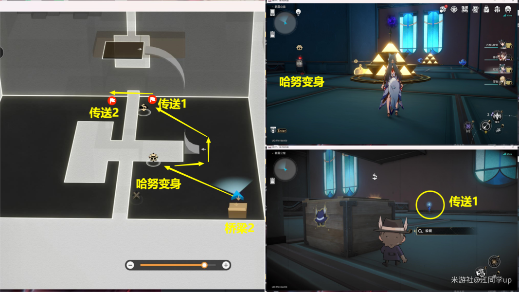 (2)从【桥梁2】上来后,变身哈努,接着从【传送1】去到【传送2】位置