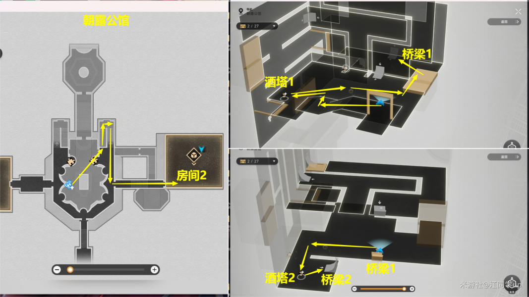 (1)来到【朝露公馆】下图位置【房间1】里面,从【酒塔1】获得次数后,从【桥梁1】上去,接着从【桥梁2】上去