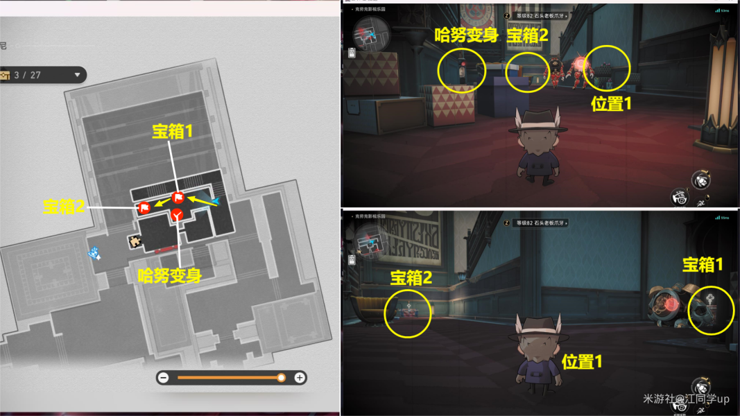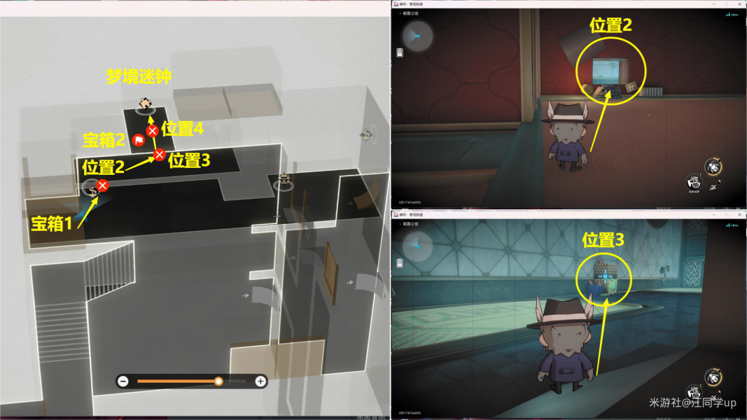 (5)然后从下图【位置2】进去,进去后,将【位置3】打开后,里面是【宝箱2】,接着再将【位置4】打开后,打掉里面的3个怪后,里面有个【梦境迷钟】解密