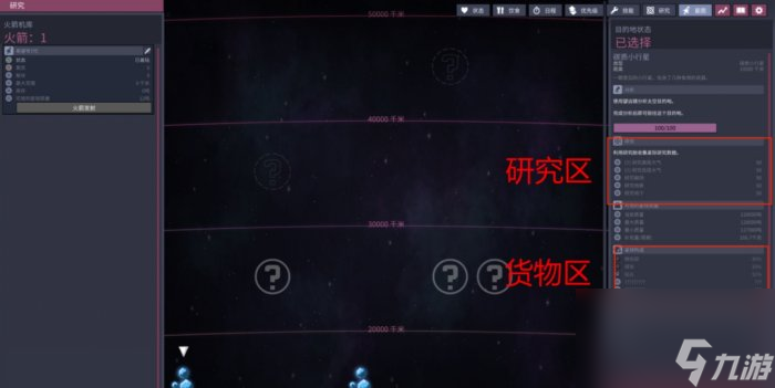 选择目的地:在火箭能飞的范围里选择(蒸汽1层,石油11层,液氢18层),我们一般以两个原则选择目的地,要么是没研究过的,要么是去拉货。