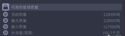 在星图中点击星球可以在右边看到这个条目,火箭拉货回来会减少对应星球对应的质量,比如图中星球质量是128000吨,如果我一次拉回来12吨货物,那么该星球的质量就会减少到127988吨,此时再去拉货就拉不了一点。只能等星球慢慢恢复质量,比如图中是166.7kg每周期,不同的星球恢复速度不同(越远的越慢)。