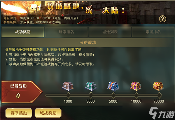 (2) 每次城池争夺战,获得足够的战功可以领取宝箱奖励。战功排名靠前的玩家可以获得排名奖励;