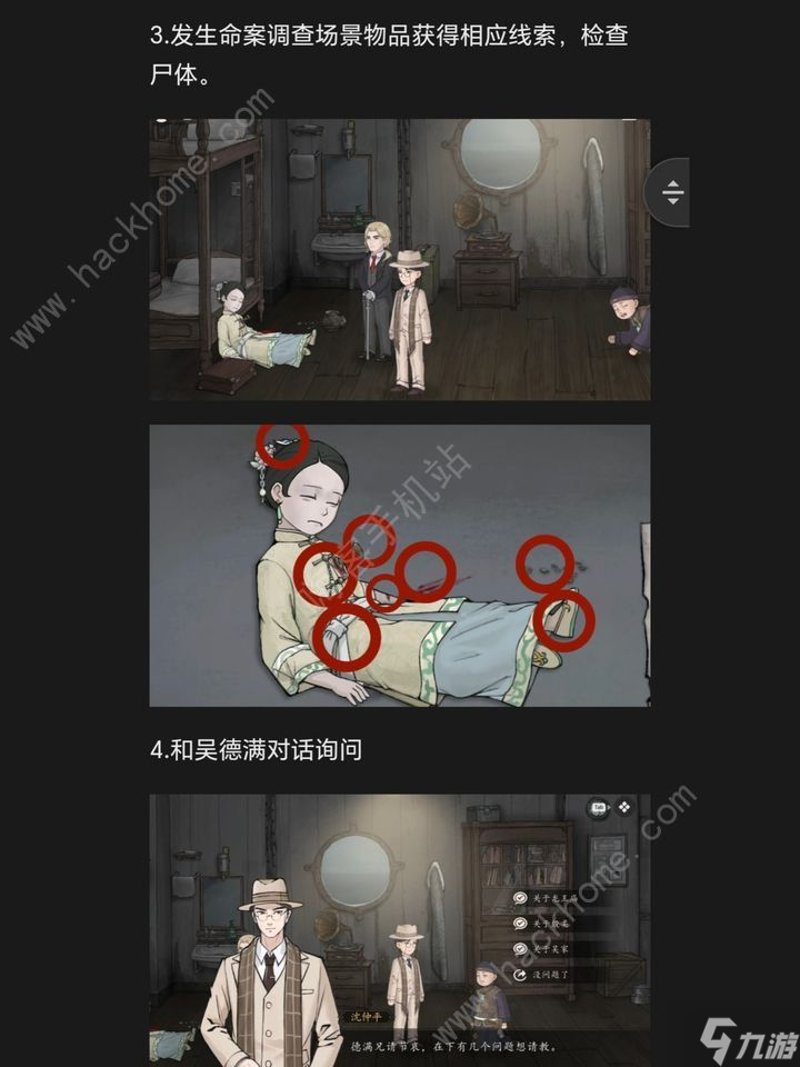 3.发生命案调查场景物品获得相应线索,检查尸体。4.和吴德满对话询问。