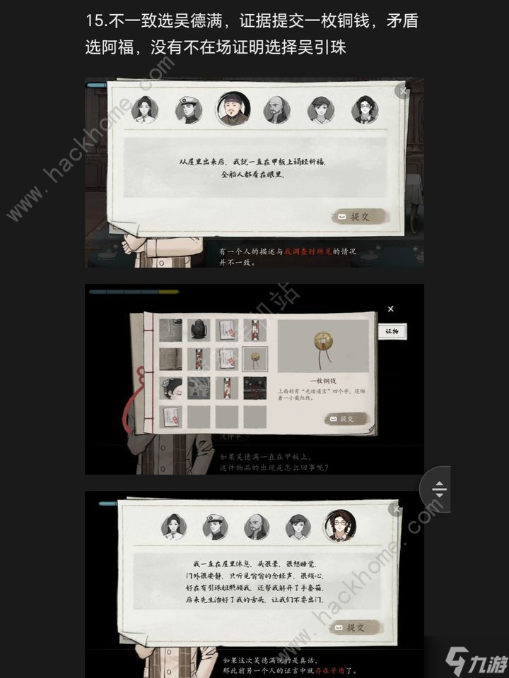 15.不一致选吴德满,证据提交一枚铜钱,矛盾选阿福,没有不在场证明选择吴引珠。