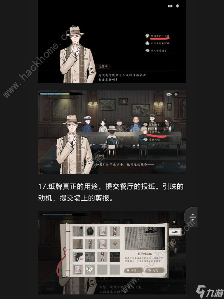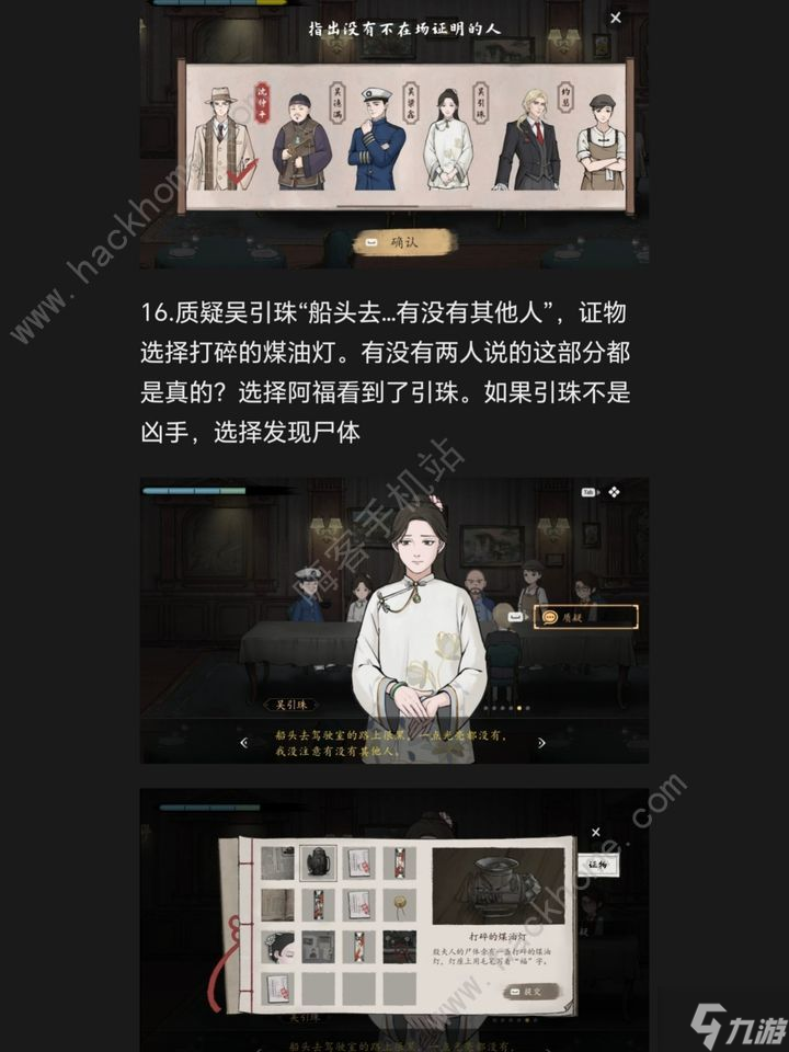 16.质疑吴引珠“船头去有没有其他人”,证物选择打碎的煤油灯。有没有两人说的这部分都是真的?选择阿福看到了引珠。如果引珠不是凶手,选择发现尸体