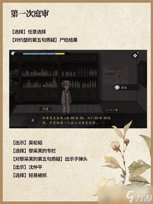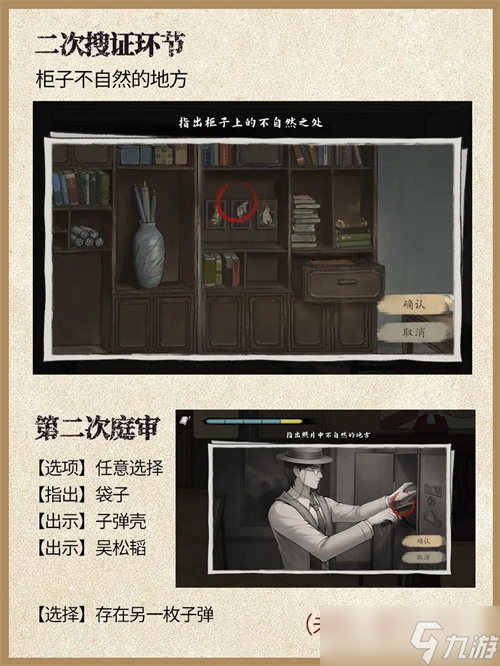 进入第二次庭审前,玩家需再次搜集证据,包括到洋货铺与李巡捕对话,并调查秘密地窖。
