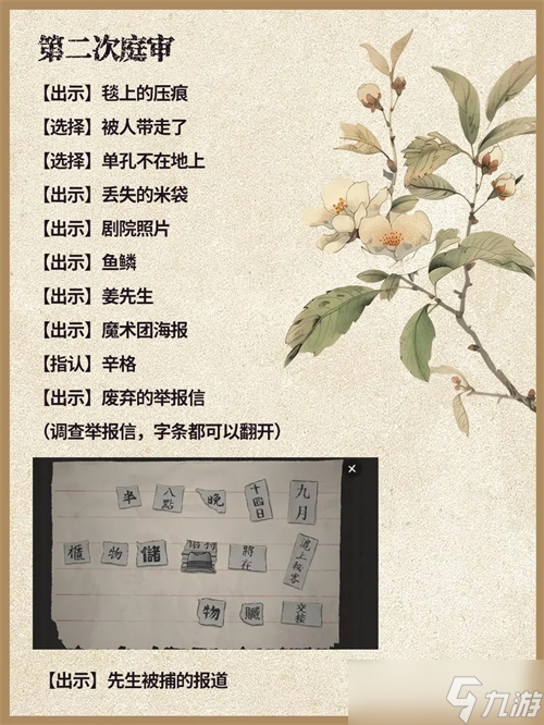 在第二次庭审中,玩家通过出示地毯上的压痕、丢失的米袋、剧院照片等证物,逐步揭露真凶的身份。