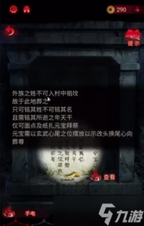 2、用手电筒照在墙上会出现文字线索,照在墓碑上会出现相关文字,到吴的墓碑上会出现一个陌生的女人。