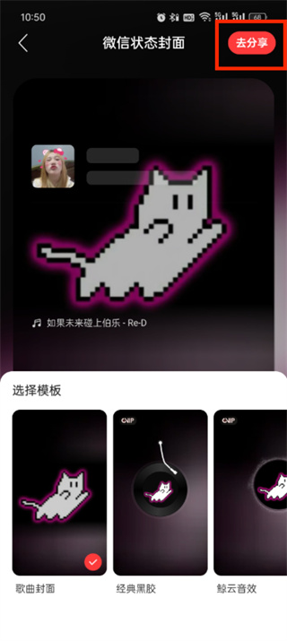 4、最后点击后在微信状态封面的页面中选择好模版,随后点击【去分享】即可;
