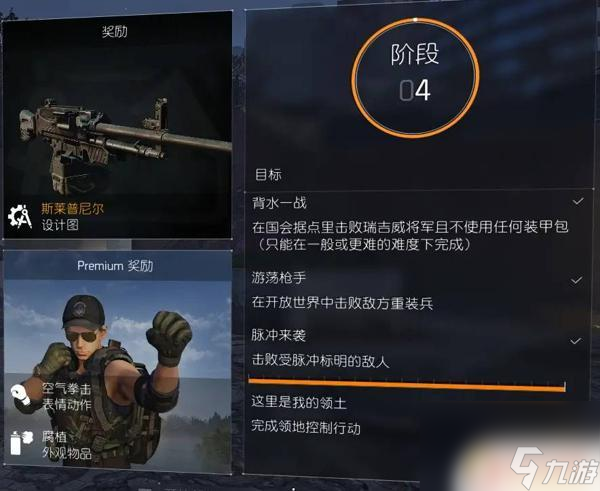 4、阶段4、推荐过程:通关一般难度的国会大厦并且在整个副本中都不能使用装甲包→完成这里是我的领土和游荡枪手并在完成途中完成脉冲来袭。