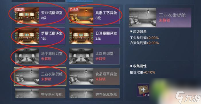 2.因此为了提升贸易的总利润,除了必要的高等级商船和一些SS级航海士。还有贸易船舱的改造,这里建议将船舱改装成“地中海规划室-罗曼语翻译室-兵器工艺货舱-亚非语翻译室-工业衣染货舱”。