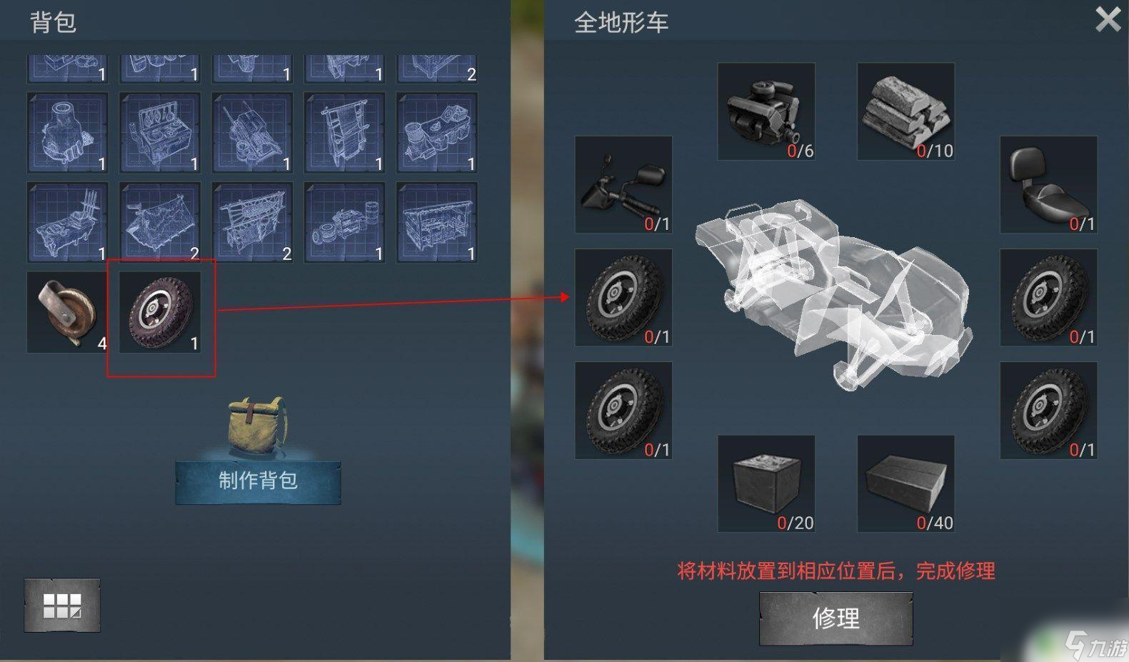 成功找到背包中的零件后,将其拖拽到对应的全地形车部位。