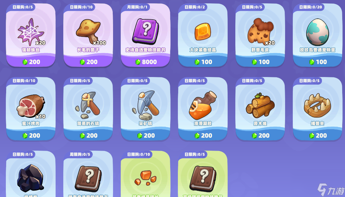 像“配备结晶碎片”、“野兽毛皮”、“大块配备结晶”、“强韧蛛丝”、“长毛菌子”等逐日限购质料