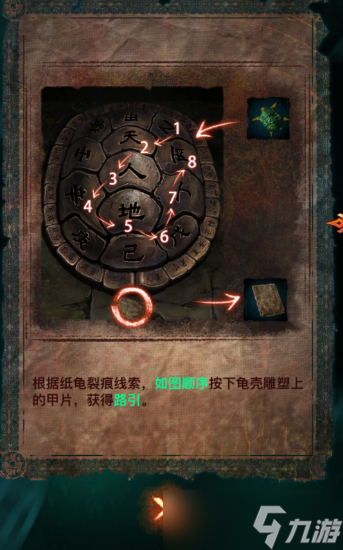 1、玩家完成算命左侧的击鼓后,就可以拿到龟壳上缺失的一块,然后将其装在壳上