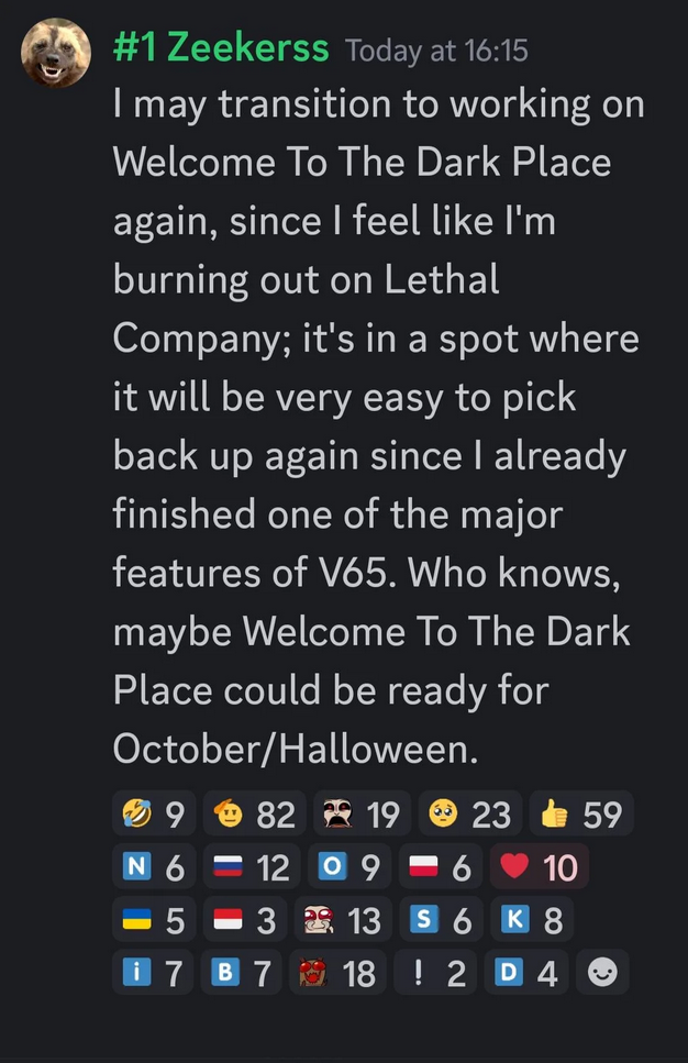 他写道:“我可能会再次转向《欢迎来到黑暗之地》的开发,因为我觉得自己在《致命公司》上有些‘燃烧殆尽’了;它目前处在一个很容易重启继续开发的阶段,因为我已经完成了主要更新 V65 版本。”