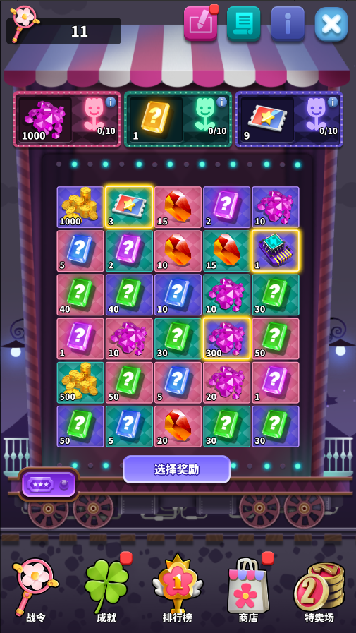 2.每次翻开贺卡,会随机出一项奖励,以及一种卡面颜色(青色,粉色,蓝紫色)。