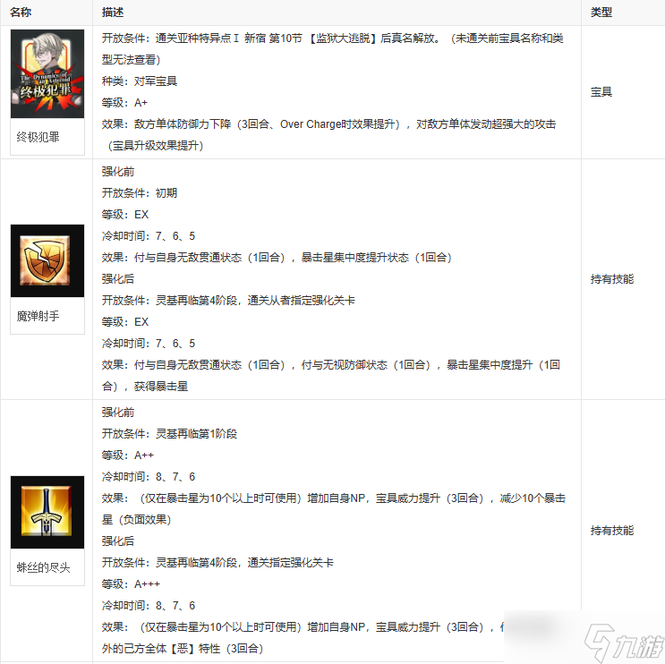 终极犯罪,等级:A+,种类:对军宝具,有效范围:1-99,最大捕捉:100人。