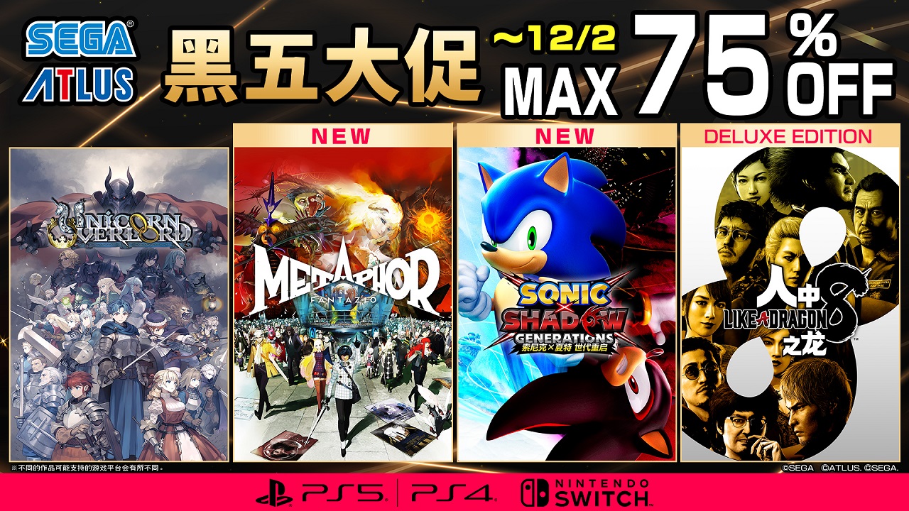 世嘉开启 “SEGA 黑五大促”活动, PlayStation ™ Store 及Nintendo eShop 内销售的部分世嘉/ATLUS 出品主机 游戏 推出限时优惠价 。