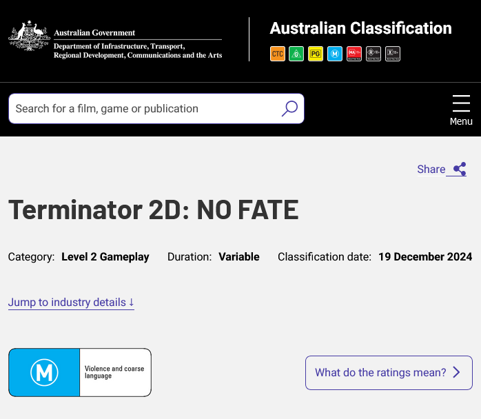 澳大利亚分级机构日前已对计划在 PS5、PS4、Xbox Series、Xbox One、任天堂 Switch 和 PC 上发布的游戏《终结者2D:NO FATE》仅凭了评级。