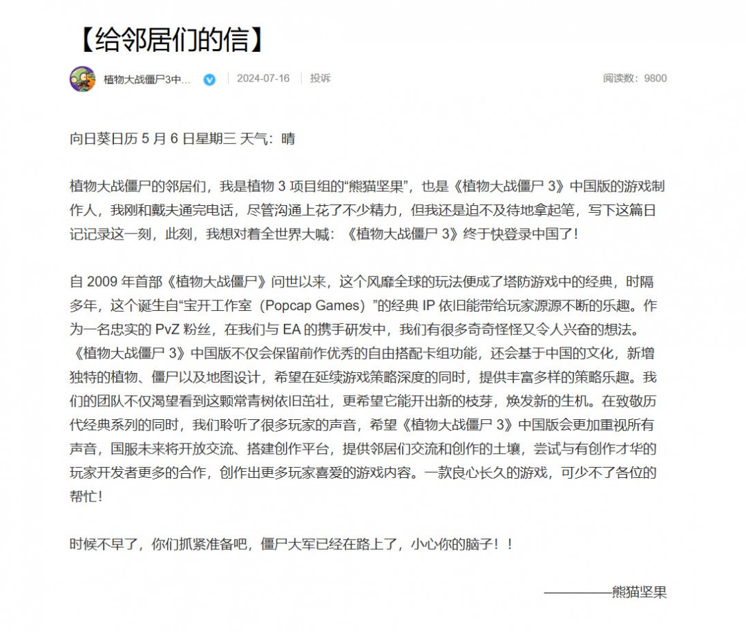 此外,他还表示《植物大战僵尸3》中国版会更加重视所有声音,国服未来将开放交流、搭建创作平台,提供邻居们交流和创作的土壤,尝试与有创作才华的玩家开发者更多的合作,创作出更多玩家喜爱的游戏内容。