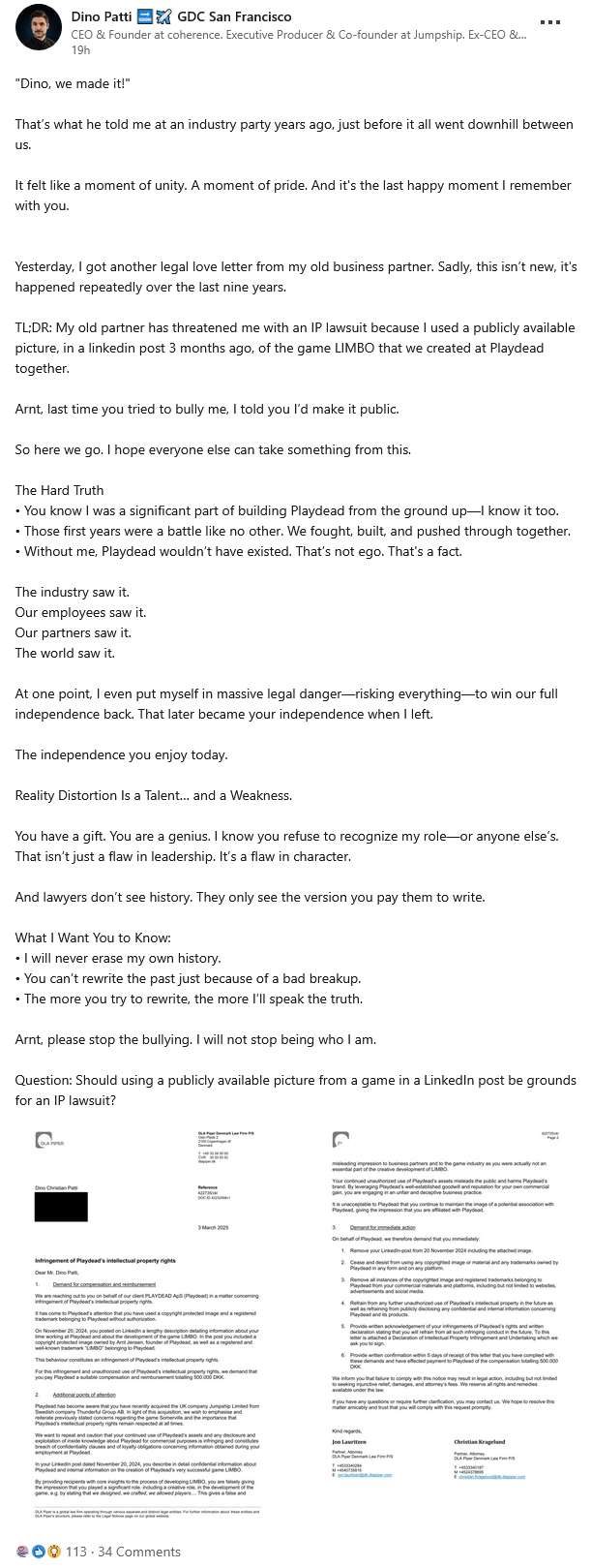 据 Patti 目前称,Jensen在过去 9 年里“多次”威胁要对他采取“法律行动”。他之所以现在公开这些事情,是因为“上次(Arnt)试图欺压我时,我告诉(他)我会曝光此事。”Patti 还表示,他本人是“从零创立 Playdead的重要部分……没有我,Playdead就不会存在。这并非自大。这是事实。”