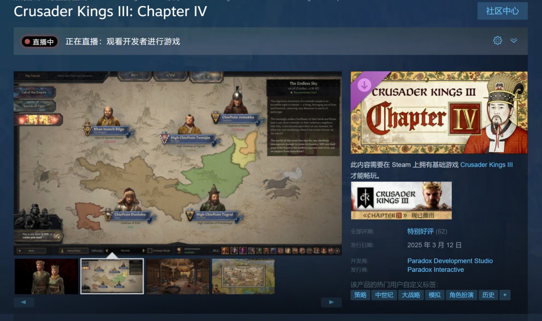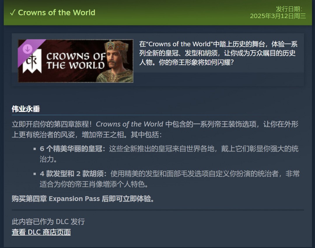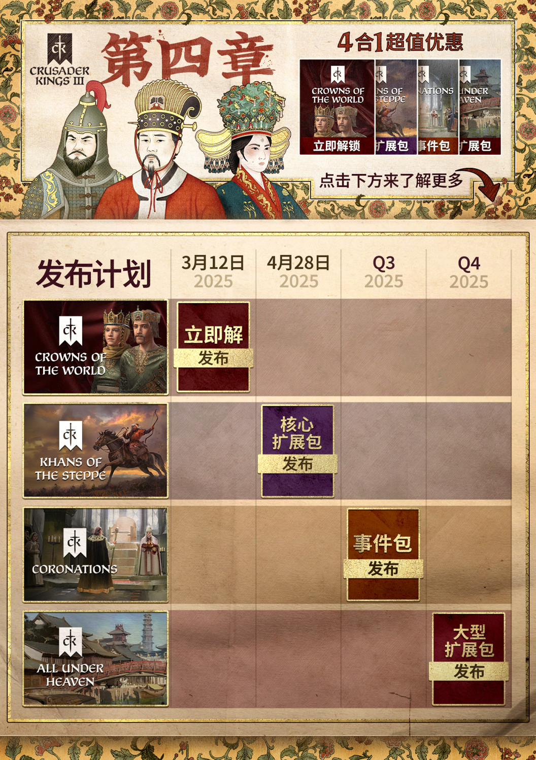 《十字军之王3》季票“第四章(Chapter IV)”现已上线,国区售价174元,支持简体中文。“第四章”包含四个DLC——「世界之冠」装饰包,「草原汗王」核心扩展包,Coronations加冕活动包和大型扩展包「溥天之下」。