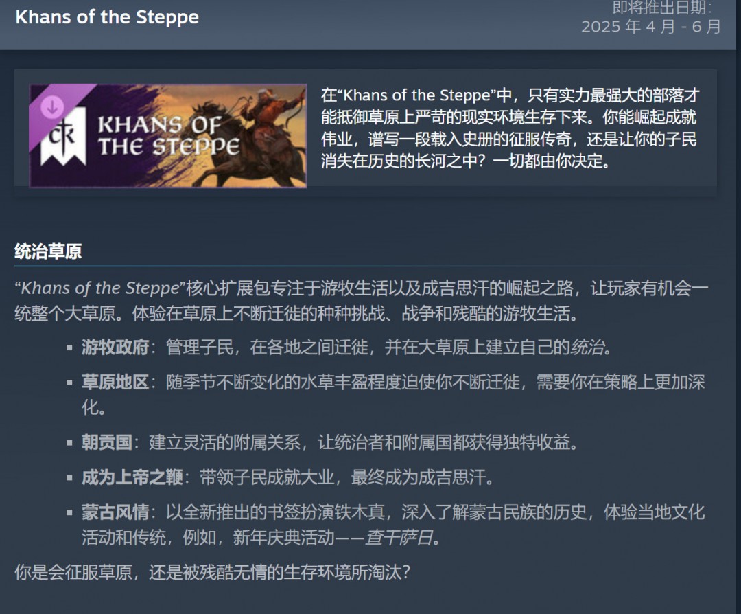 虽然目前尚未公布发布日期,但您可以期待我们在「草原汗王」发布后不久就会开始针对该扩展包常规的深度开发日志,暂定于5月份开始。