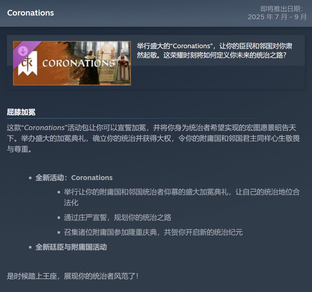 “加冕”作为一种新的活动类型,让您亲身体验这一事件。与宗教权威协调,举行完美的加冕仪式,在诸侯和臣民心目中确立您的统治权。要明智地计划,因为这一活动的后果可能会影响您的整个统治乃至更长的时间。