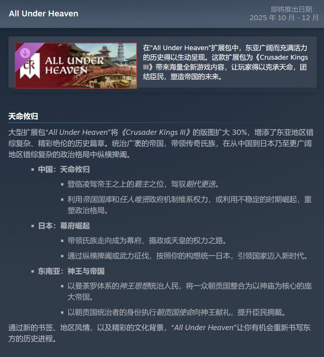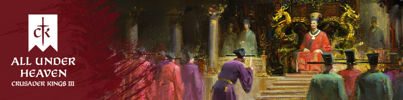 「第四章」的压轴大型扩展包「溥天之下」,将成为《十字军之王》历史上规模最大、最雄心勃勃的扩展。我们将补齐整个中世纪的世界地图,将范围扩展到整个亚洲。这一大规模扩展将带来全新的游戏玩法、独特的政府以及对中世纪生活的完全不同的看法。