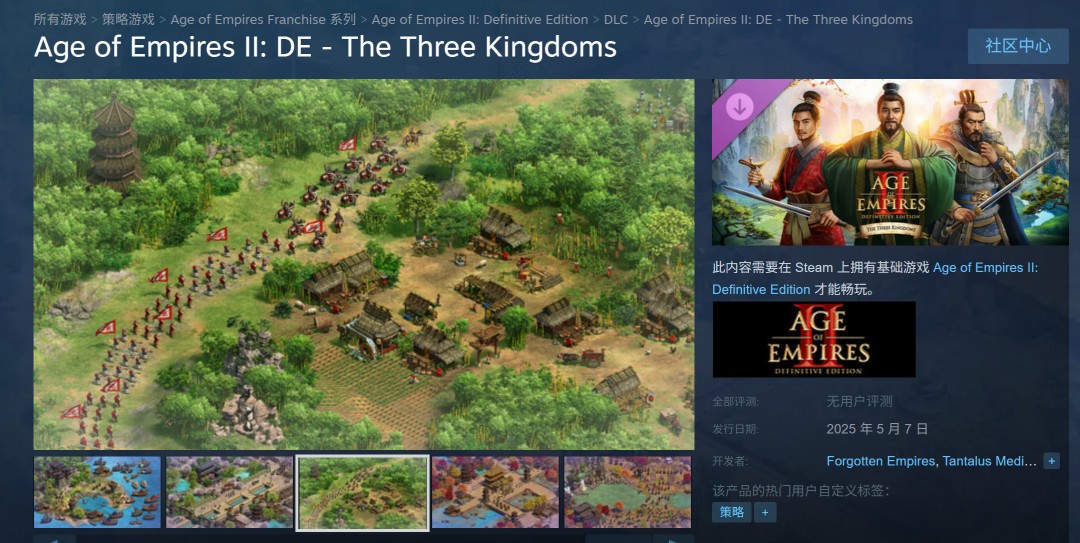 《帝国时代2:决定版》全新DLC“三国(The Three Kingdoms)”将于5月7日发售,Steam预购特惠83.3元,自带简体中文和中文配音。该DLC需要购买本体游戏《帝国时代2:决定版》才能游玩。